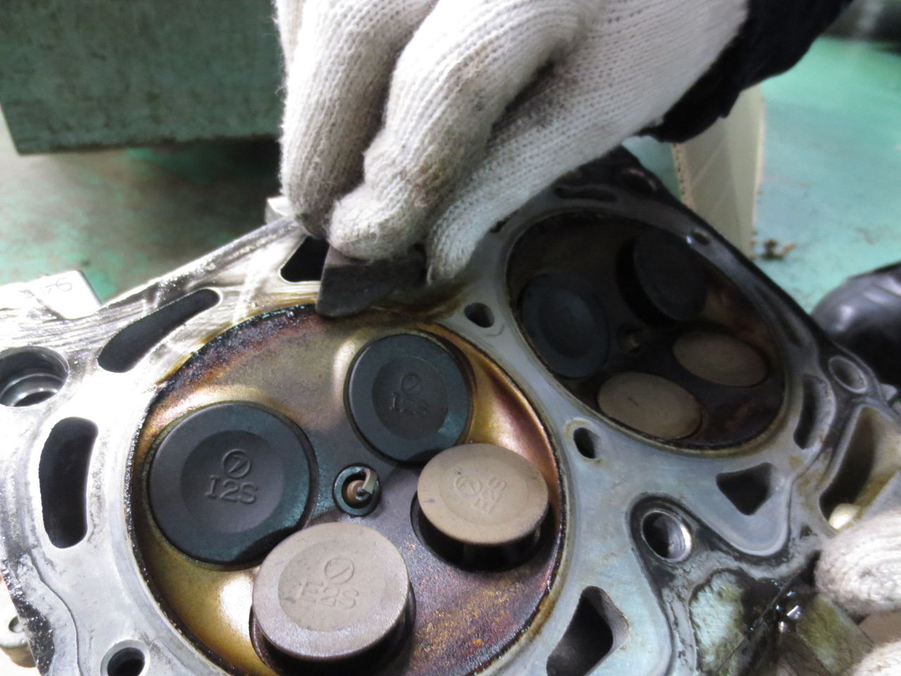 研ぎ石で接着面を研いでピストンを清浄します。