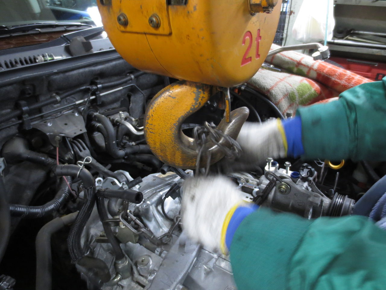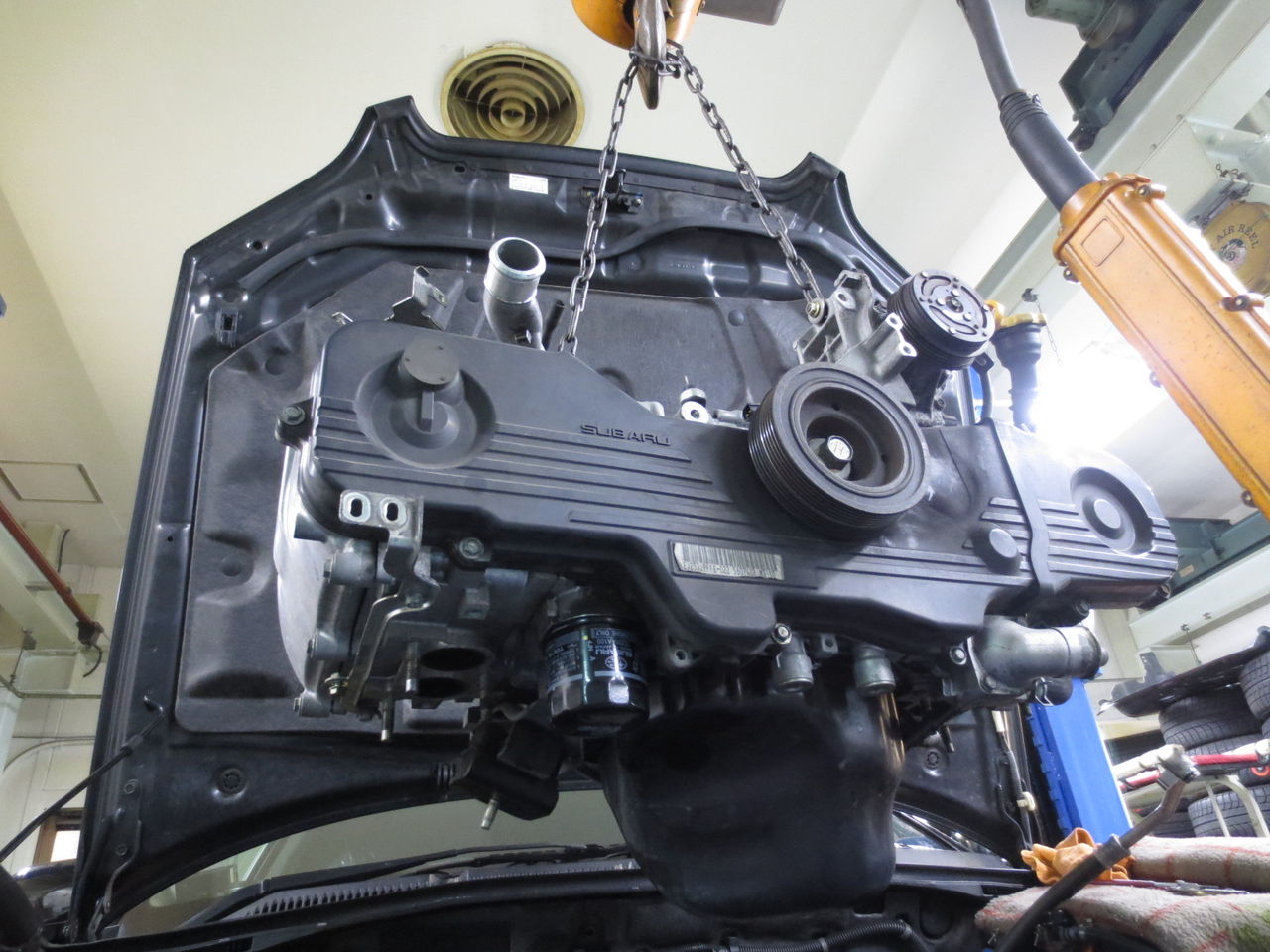 エンジンを吊り上げて元に戻していきます。